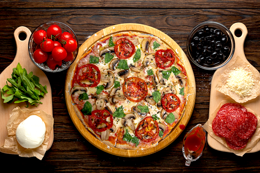 Pizza con masa romana delgada, salsa pomodoro, queso mozzarella, champiñones blancos tajados, espinacas, tomates secos y oregano,