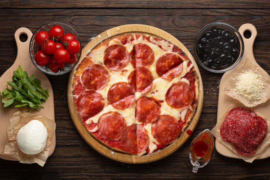 Pizza con masa romana delgada, salsa pomodoro, queso mozzarella y chorizo de vela (se puede cambiar el chorizo por salami o pepperoni.